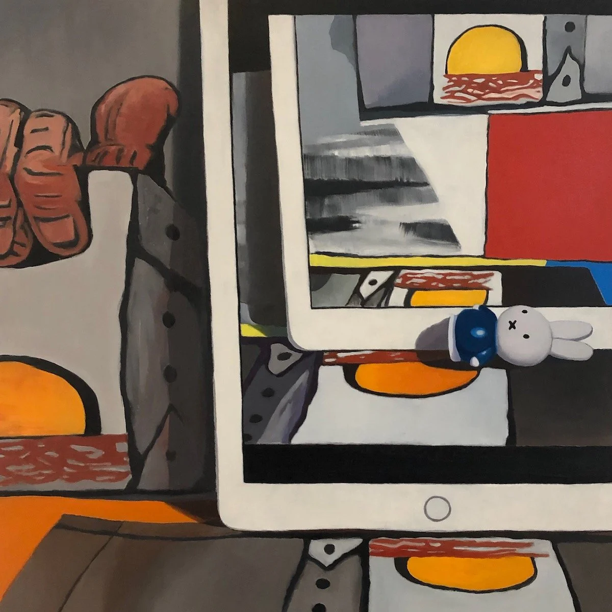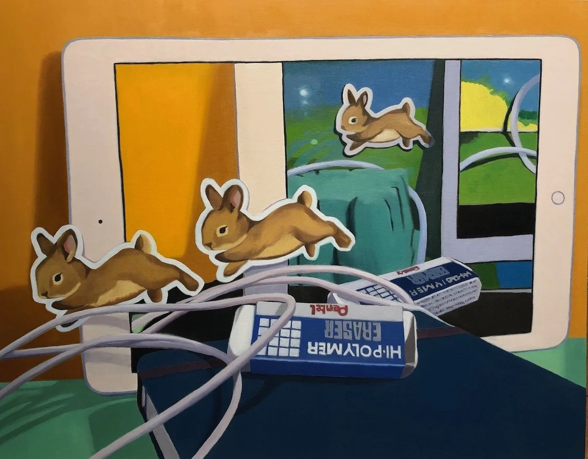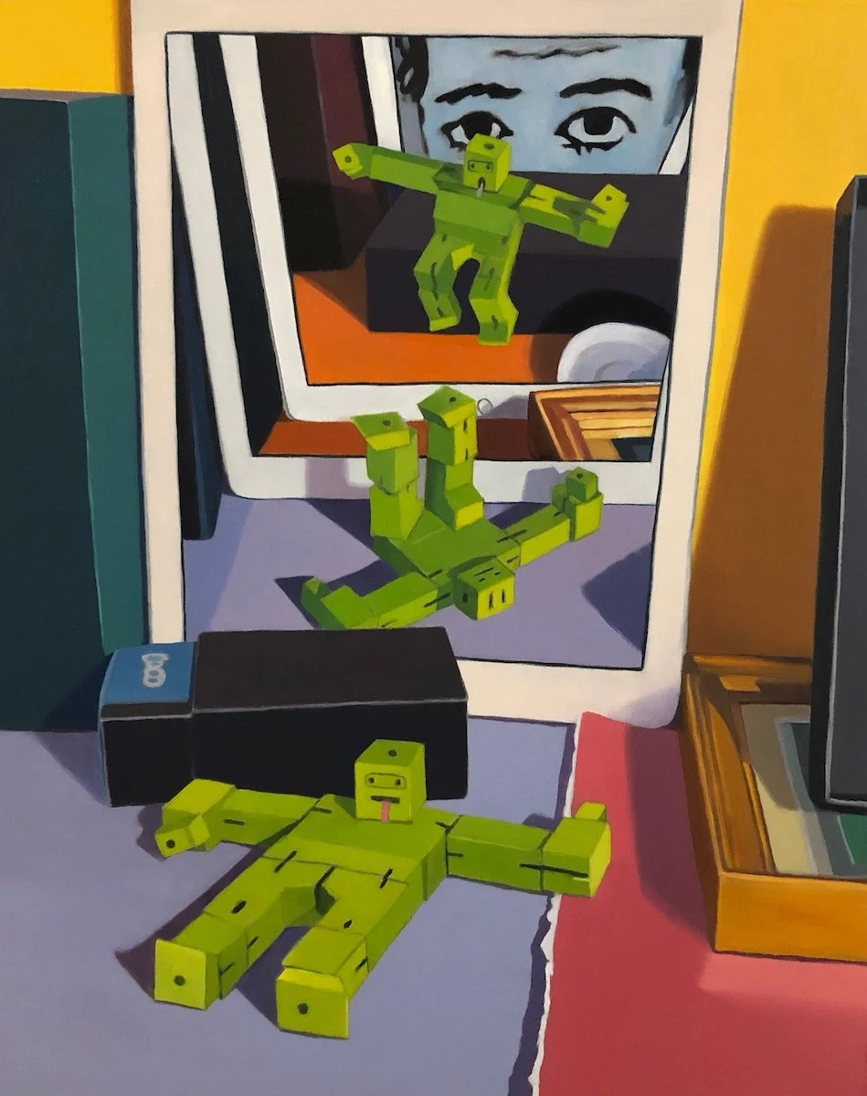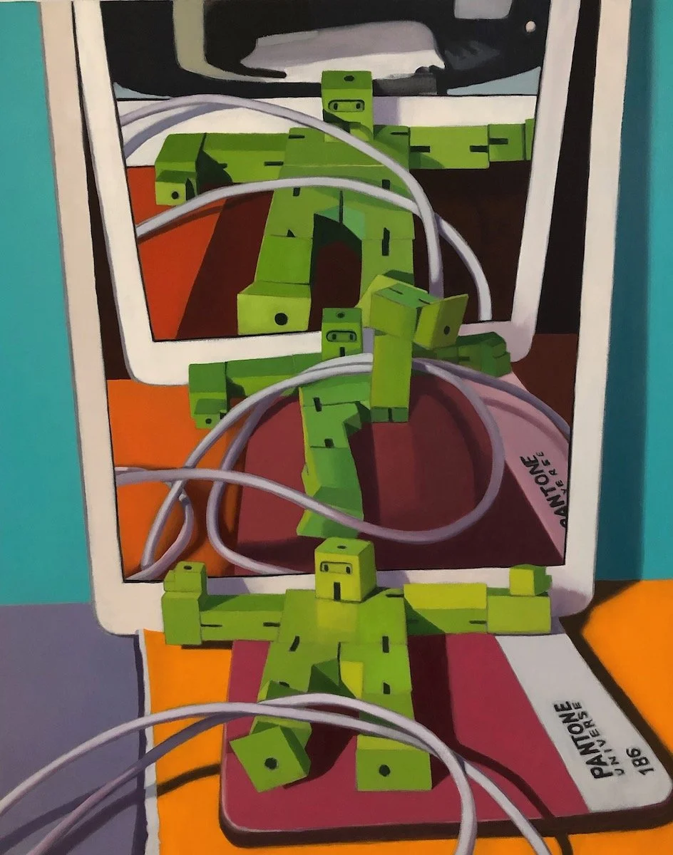 I made 14 Screentime paintings between March 2020 and April 2021. The last one, Group Meditation, is an homage to Philip Guston. The other paintings in this series feature closeup views of desktop dioramas. My intention was to pan out, showing a more distanced view of collaged images of his work. Through this, I planned to conclude this series and the confinement of this lockdown. I had just received my second vaccine and desired to escape through my studio window to the outside world.