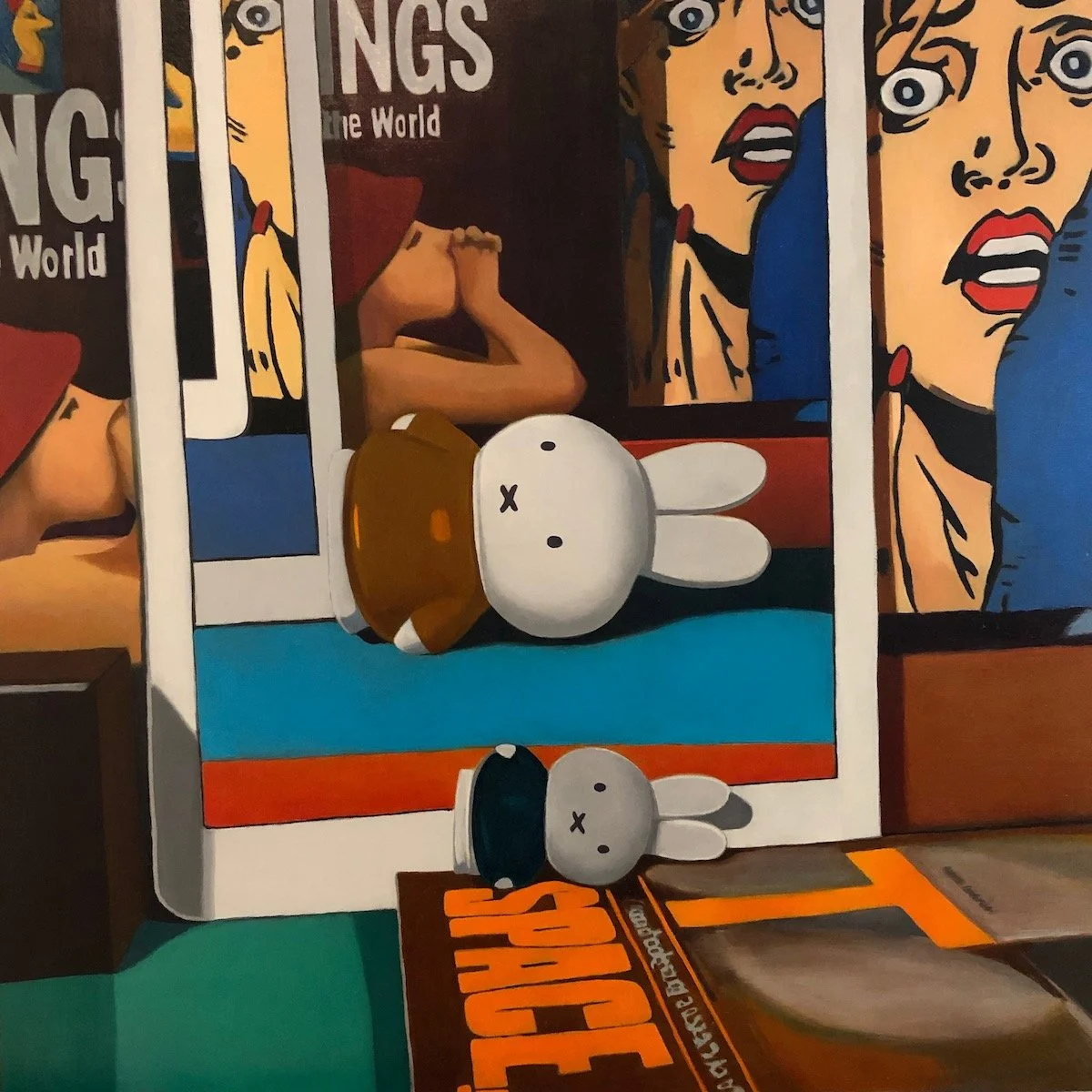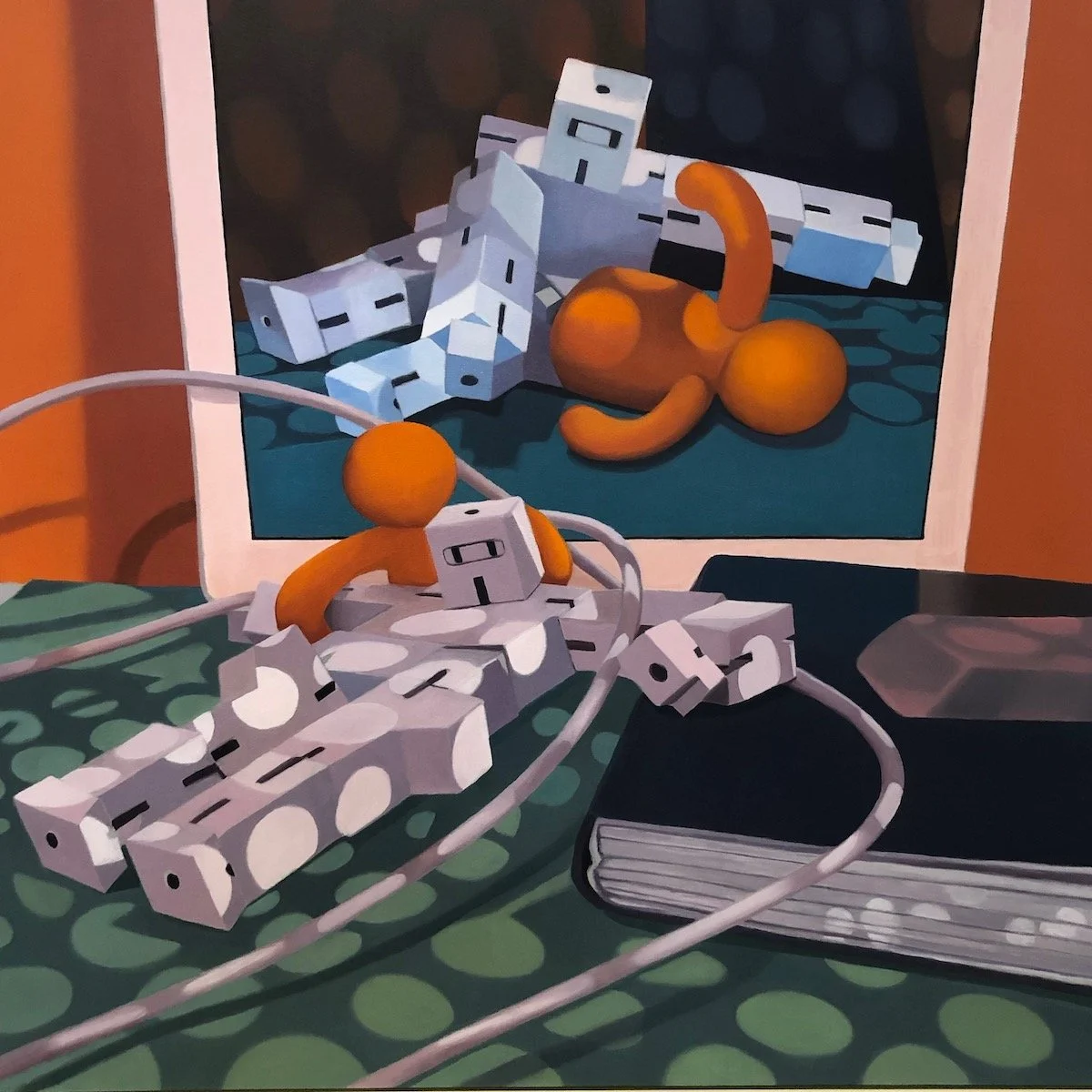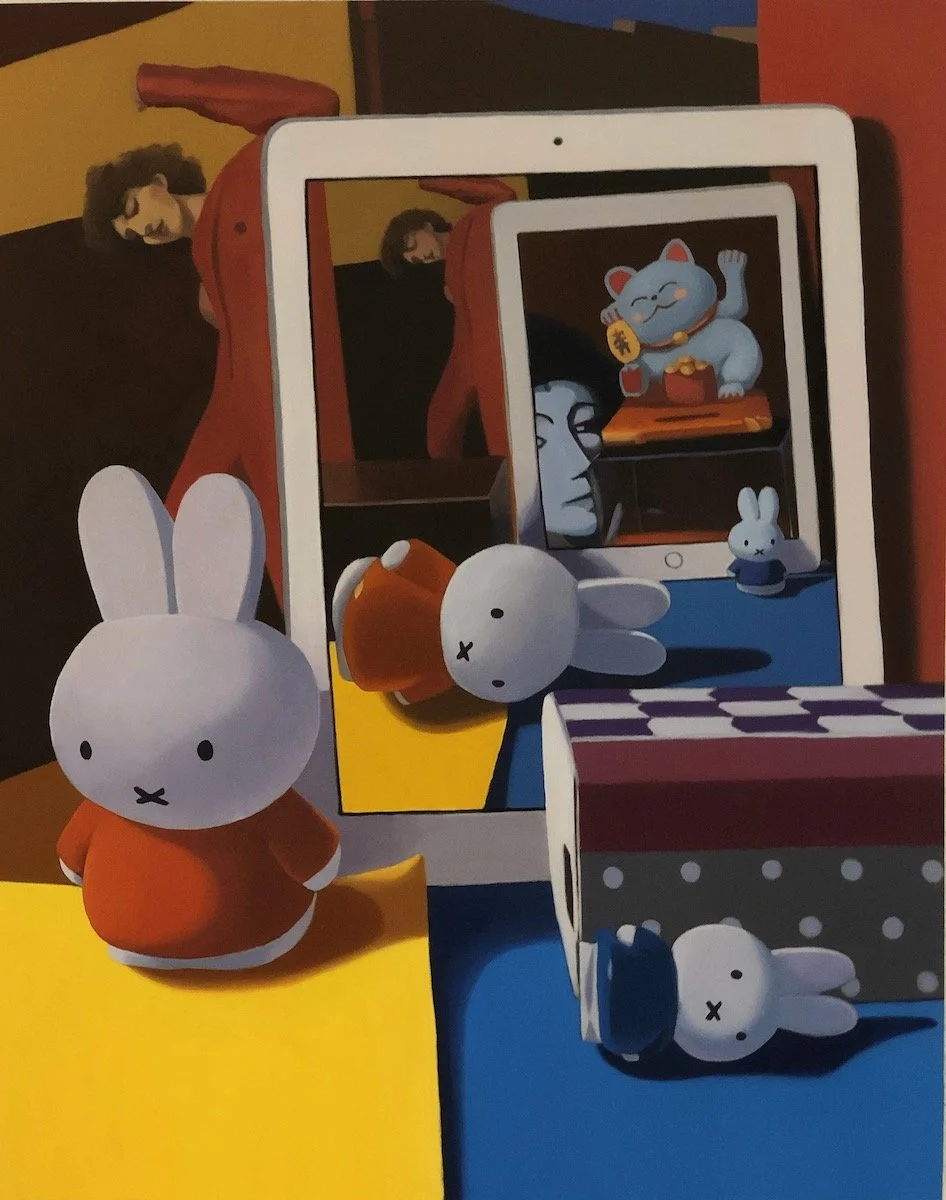 I made 14 Screentime paintings between March 2020 and April 2021. The last one, Group Meditation, is an homage to Philip Guston. The other paintings in this series feature closeup views of desktop dioramas. My intention was to pan out, showing a more distanced view of collaged images of his work. Through this, I planned to conclude this series and the confinement of this lockdown. I had just received my second vaccine and desired to escape through my studio window to the outside world.