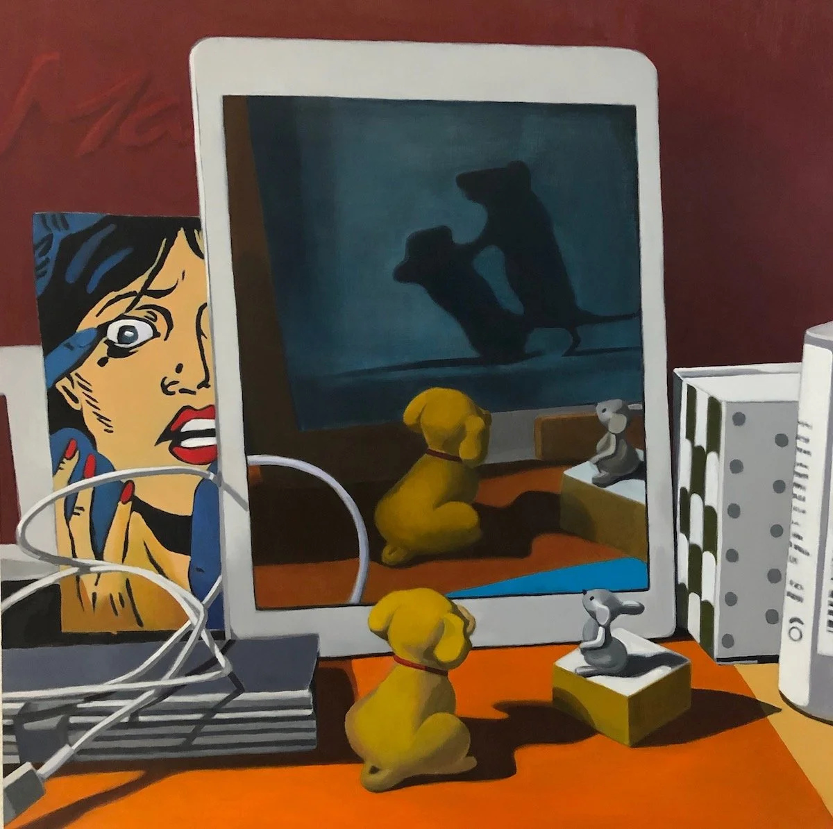 If I was forced to stay inside, I would play. Using some of my favorite art images, studio paraphernalia – boxes, cords, and childhood toys – my desktop became a stage and a screen. Two mice fighting became stars on this stage, while my toy mice and toy dog look on. They watch themselves watching the fighting mice. We are all stars on the internet.